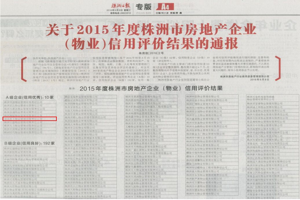 詳見2016年6月8日株洲晚報A4版、株房信【2016】2號《關(guān)于2015年度株洲市房地產(chǎn)企業(yè)(物業(yè))信用評價結(jié)果的通報》
