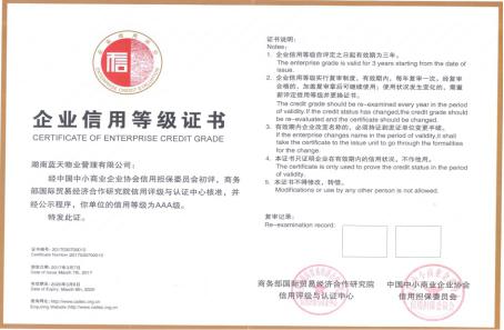 2017年3月,在中國(guó)中小商業(yè)企業(yè)協(xié)會(huì)主辦的信用等級(jí)評(píng)定活動(dòng)中,經(jīng)中國(guó)中小商業(yè)企業(yè)協(xié)會(huì)信用擔(dān)保委員會(huì)初評(píng),商務(wù)國(guó)際貿(mào)易經(jīng)濟(jì)合作研究院信用評(píng)級(jí)與認(rèn)證中心核準(zhǔn),并經(jīng)公示程序,我公司榮獲信用等級(jí)AAA級(jí)信用企業(yè)的獎(jiǎng)牌和證書。