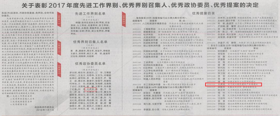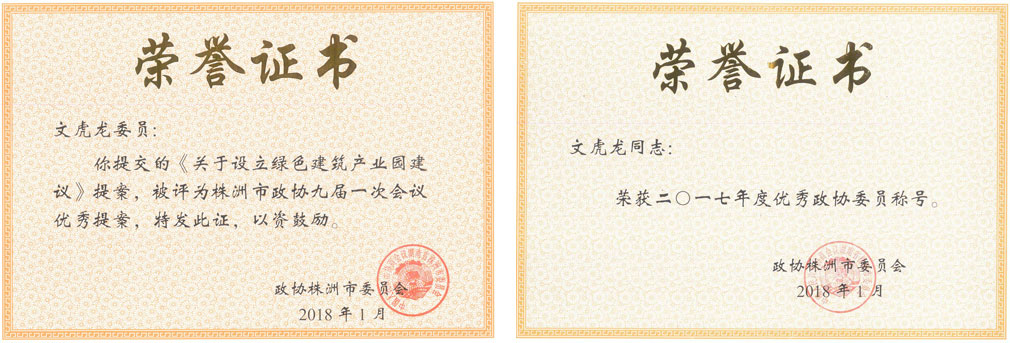 文虎龍先生是藍(lán)天物業(yè)的創(chuàng)始人,在企業(yè)管理方面有著獨(dú)特的見解,在政界以及其他社會(huì)組織也是嶄露頭角,他是株洲市物業(yè)行業(yè)成立以來,首個(gè)加入“株洲市政協(xié)委員”的創(chuàng)先者。多年來,他一直兢兢業(yè)業(yè)干好本職工作,努力做一名優(yōu)秀的政協(xié)委員,為我市的經(jīng)濟(jì)、社會(huì)發(fā)展建設(shè)貢獻(xiàn)自己的力量,連續(xù)幾年被評為株洲市優(yōu)秀政協(xié)委員。在擔(dān)任政協(xié)委員、政協(xié)常委期間,他積極履行職責(zé)、建言獻(xiàn)策,其中提交的《關(guān)于設(shè)立綠色建筑產(chǎn)業(yè)園建議》提案被評為2017年度“優(yōu)秀提案”。