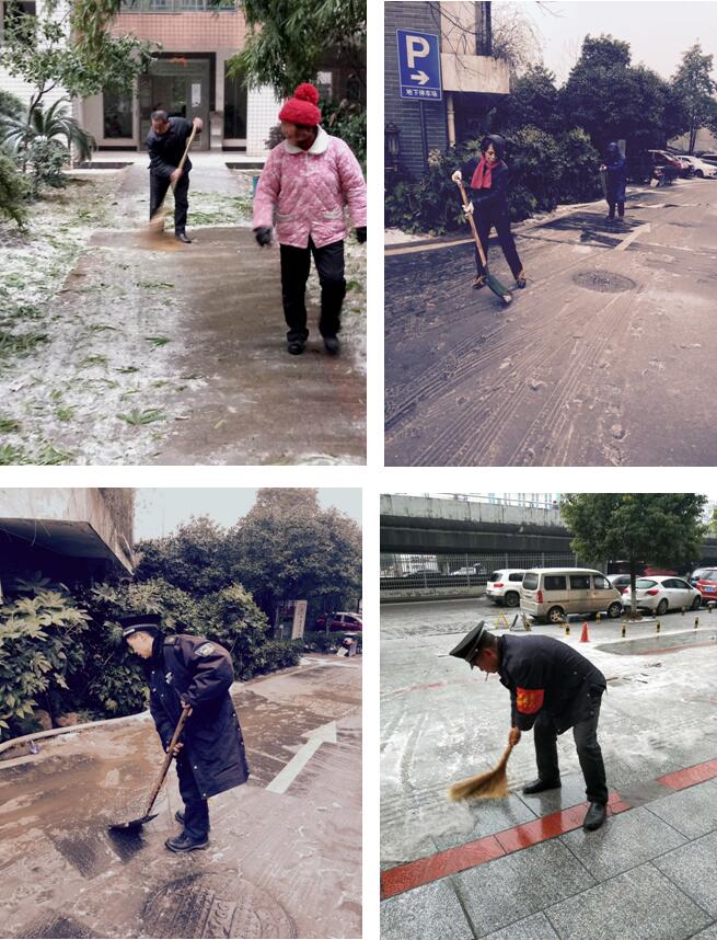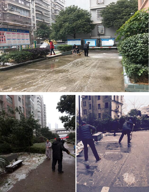 1月25日晚間起,湖南地區(qū)迎來今年立冬以來的第一場降雪及冰凍,鵝毛般的大雪紛紛灑灑的落下,給整個株洲大地披上了一層銀裝,大家紛紛感嘆猶如銀裝素裹,分外妖嬈!大雪雖然飄得不久,但冰凍天氣一直持續(xù)到現(xiàn)在,積雪及結(jié)冰的道路給業(yè)主出行帶來了諸多不便,為暢通交通,方便業(yè)主出行,26日一大早,各項目負(fù)責(zé)人組織員工第一時間開展了鏟雪、除冰、清理樹枝等活動。 早上8點,員工們不畏嚴(yán)寒、冒著冰雪天氣陸續(xù)來到公司。在各項目負(fù)責(zé)人的帶領(lǐng)下,大家不畏嚴(yán)寒,頂著風(fēng)雪,揮舞著鐵鍬開始對項目大門口、人行道及車行道、單元門口等處的積雪和結(jié)冰進行清掃,大家你追我趕,齊心協(xié)力,配合默契,鏟的鏟、推的推、掃的掃,干的熱火朝天,不亦樂乎,忙碌的身影構(gòu)成了一道亮麗的風(fēng)景線。雖然室外溫度很低,但大家勞動的熱情和團結(jié)的力量讓這個冬日變得格外溫暖。 經(jīng)過一個多小時的奮戰(zhàn),每個項目將小區(qū)主要入口、人行道、車行道及各單元門口等地的冰雪全部鏟除,為業(yè)主開辟了一條洋溢著溫情的通暢之路。雖然大家的衣服、鞋子都弄濕了,也出了一身的汗,可看著眼前的成果,大家都很有成就感,每個人的臉上都洋溢著開心的笑容。